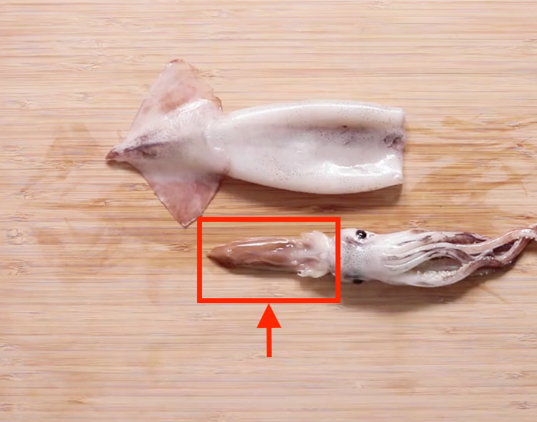 イカの体と足を分解した時に、出てくる赤い囲みの部分が「イカゴロ」です。意外と小さいです。